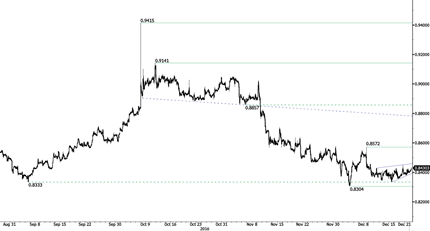美元兑瑞郎正在朝1.0300行进。小时图形阻力位于1.0344(2016年12月15日高点)。关键支撑位于平价水平。预计还会进一步盘整,朝前阻力位区域1.0205附近行进。从长线看,该货币对依然于2011年以来的区间内交易,尽管在当时瑞士央行弃守钉住政策曾出现过混乱局面。关键支撑位于0.8986(2015年1月30日低点)。尽管如此,自2015年1月取消汇率钉住政策以来,技术结构就始终倾向长期看涨偏见。