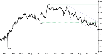 美元兑瑞郎走势看空,但平价下方的抛售压力正在减少。关键阻力位于远处的1.0344(2016年12月15日高点)。进一步下行的大门明显已经敞开。从长线看,该货币对依然于2011年以来的区间内交易,尽管在当时瑞士央行弃守钉住政策曾出现过混乱局面。关键支撑位于0.8986(2015年1月30日低点)。尽管如此,自2015年1月取消汇率钉住政策以来,技术结构就始终倾向长期看涨偏见。
